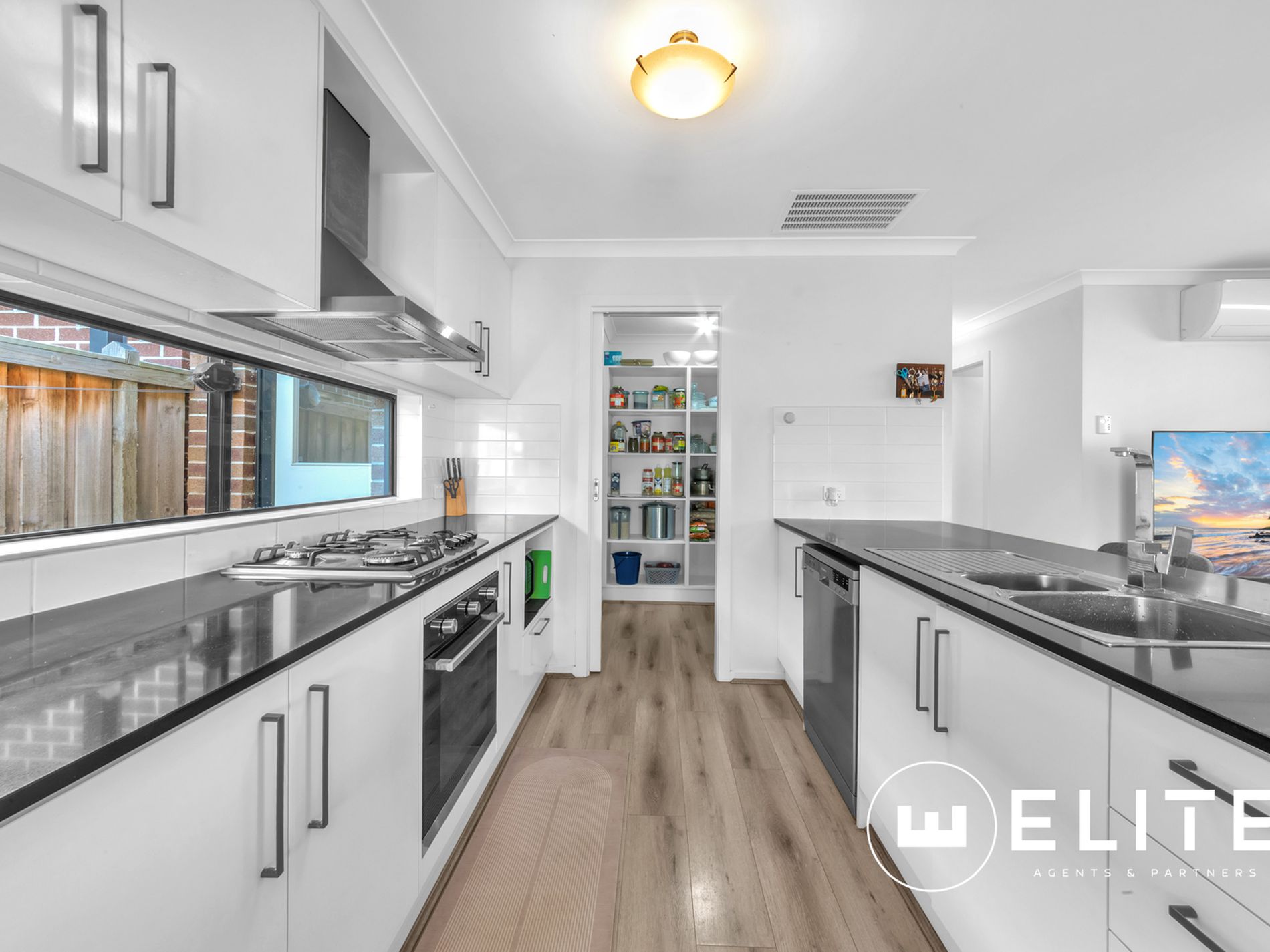 • Stylish kitchen with stone benchtops and walk-in pantry